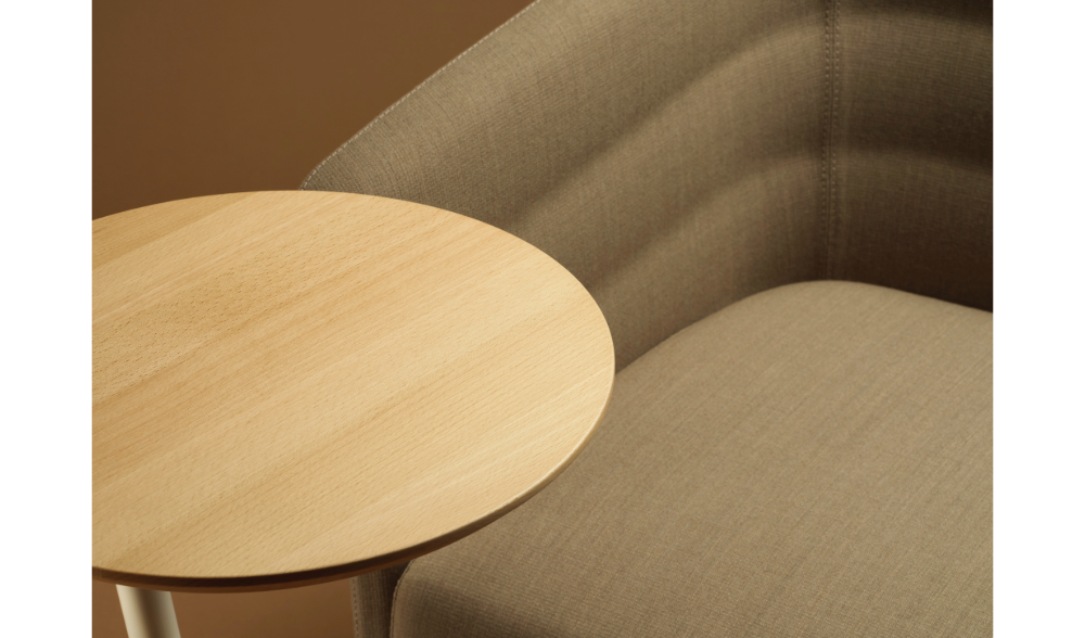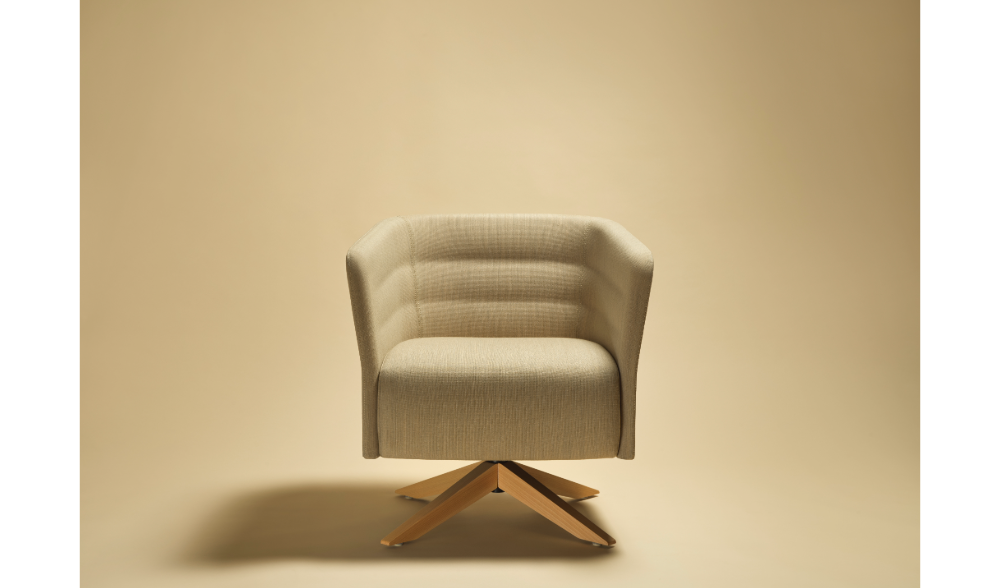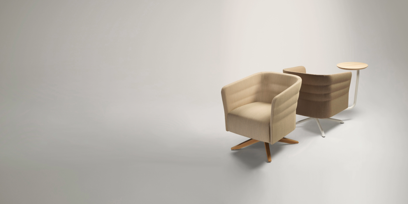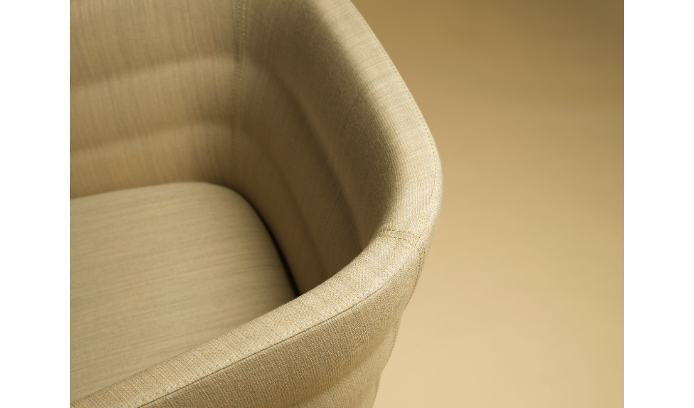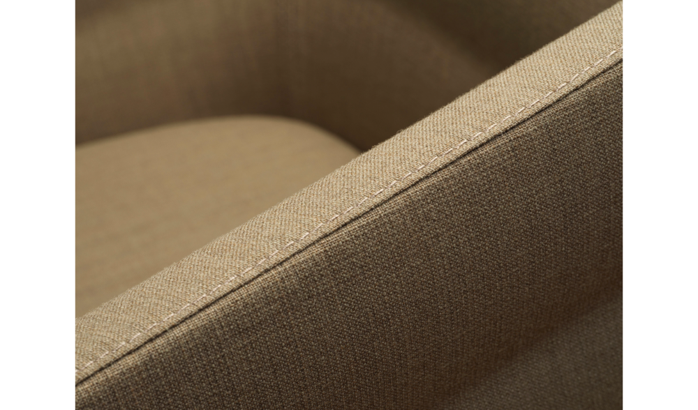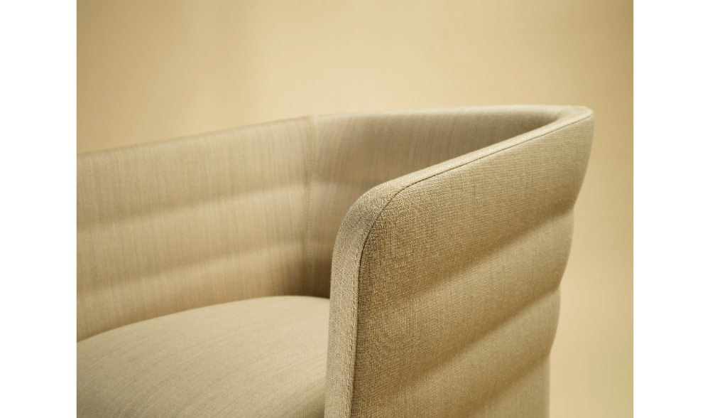 Made of 100% post-consumer recycled flame-retardant polyester, it meets sustainability criteria and is the result of a mix of single-color and melange fibres, which creates a simple but distinctive two-tone grid design. Soft to the touch, it has a dull and slightly irregular appearance that mimics the texture of natural textile fibres.
