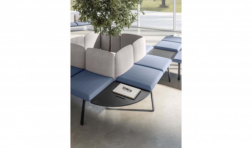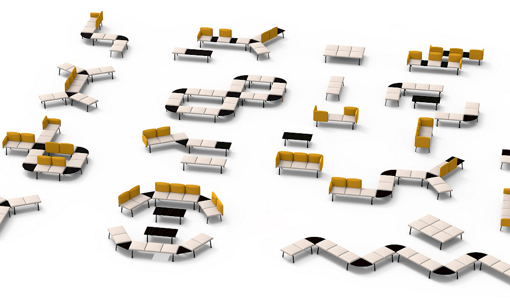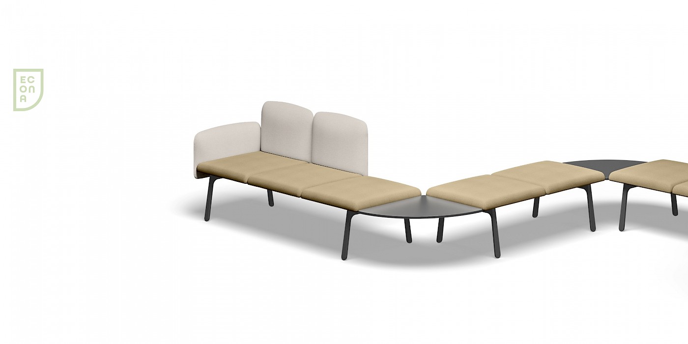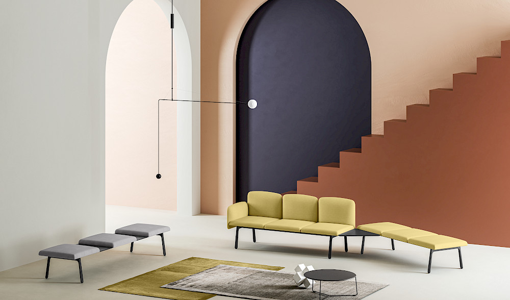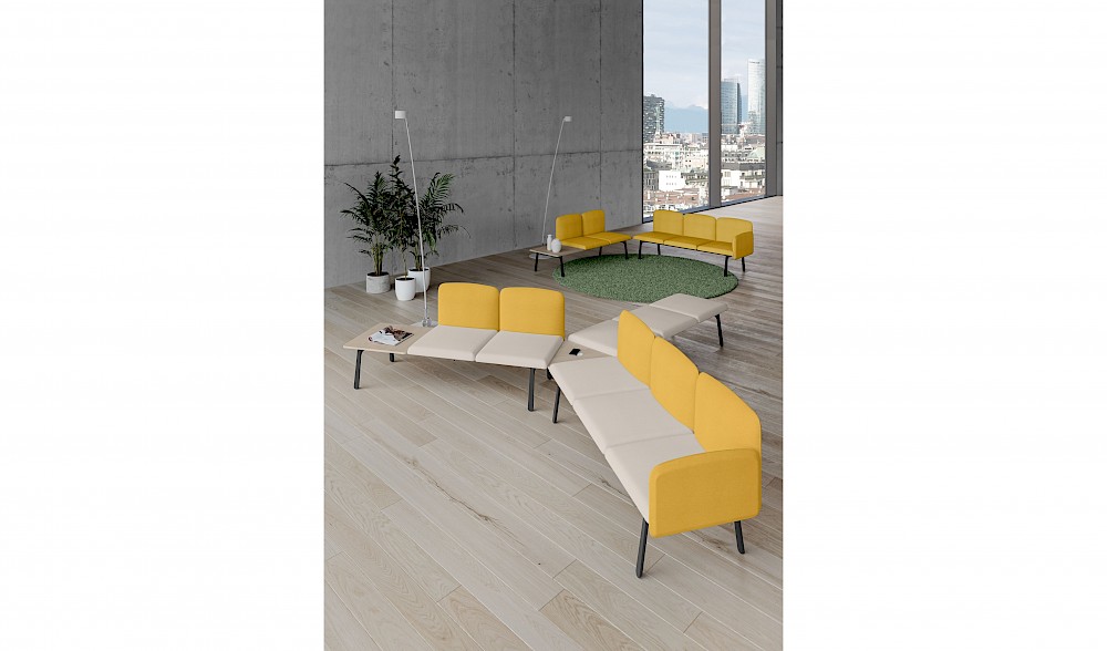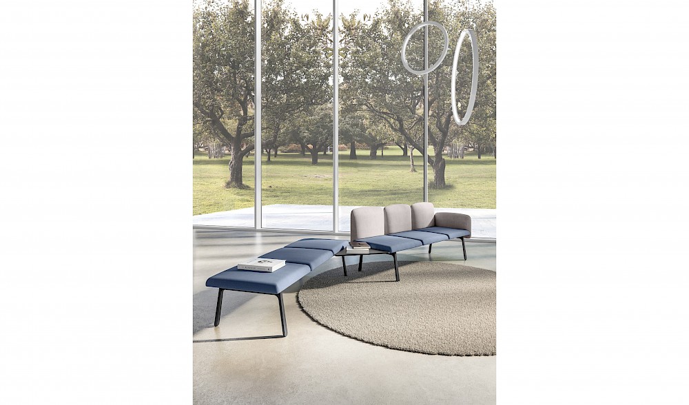 Drop is built around three elements: the backrest, armrest and seat, supported by structures housing from 1.5 to 4 units which can be connected to one another by tops in different shapes and sizes, thus creating modules with ever-changing looks.