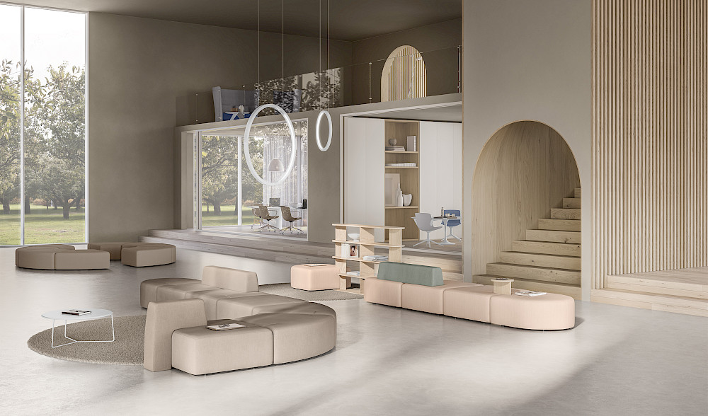 The round module allows you to play with space, creating colourful islands that invite dynamism and creativity. With the curved backrest option, Lido becomes a way to promote social interaction and communication. This new feature breaks down visual barriers, facilitating conversation and creating a welcoming and open environment that encourages connection between people.