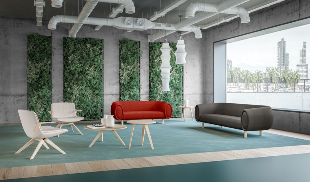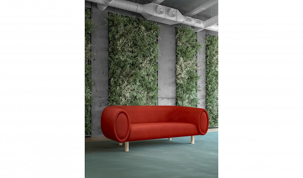 Made of 100% post-consumer recycled flame-retardant polyester, it meets sustainability criteria and is the result of a mix of single-color and melange fibres, which creates a simple but distinctive two-tone grid design. Soft to the touch, it has a dull and slightly irregular appearance that mimics the texture of natural textile fibres.