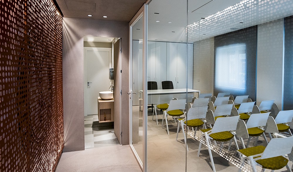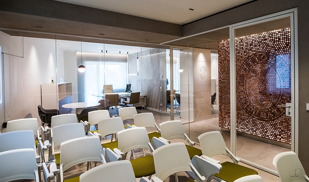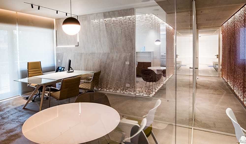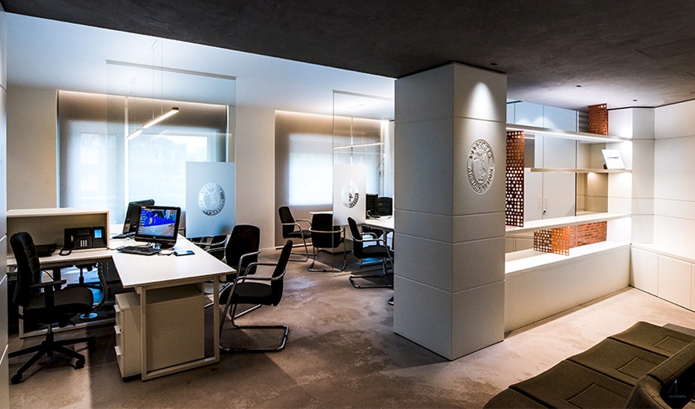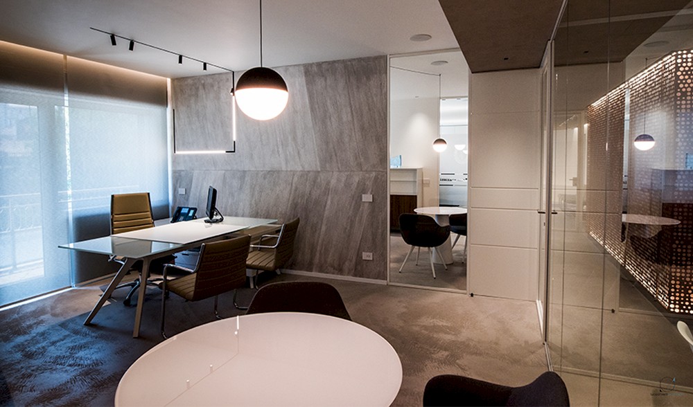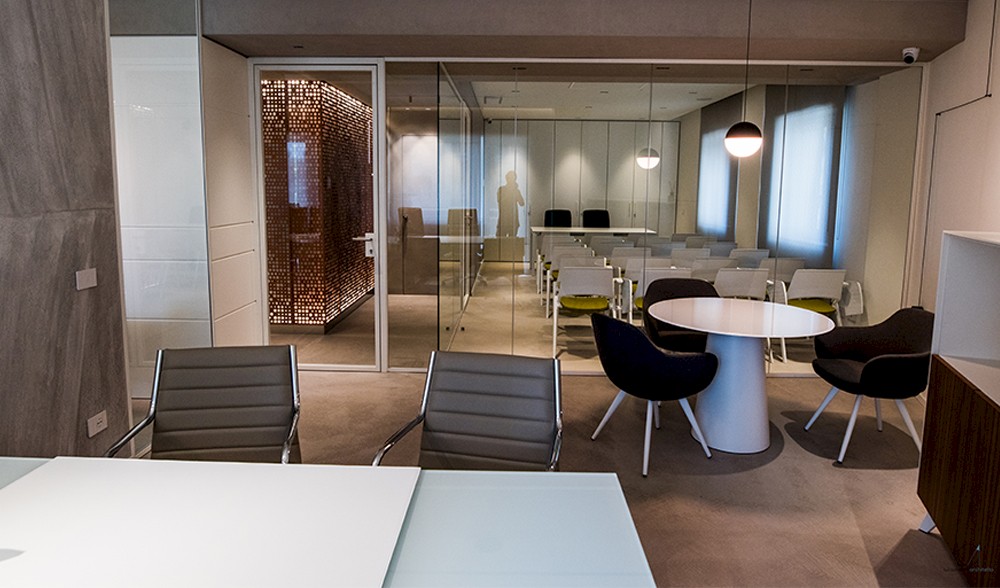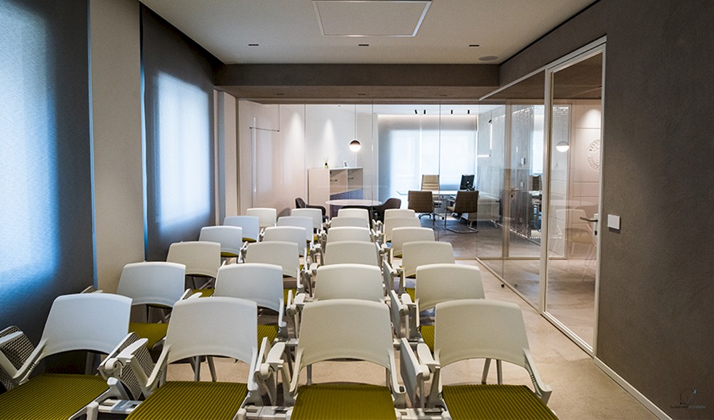The project for the realization of the offices of Vittoria Assicurazioni, in Catania, of Rampolla s.r.l. it is characterized by the redefinition of spaces with the aim of optimizing the functional aspect. The use of glass walls made it possible to separate the executive offices from the operational ones, while maintaining the visual permeability of the entire space, creating a single focal point characterized by a volume containing the company logo, covered with a perforated sheet.