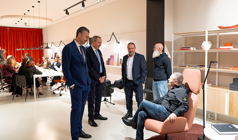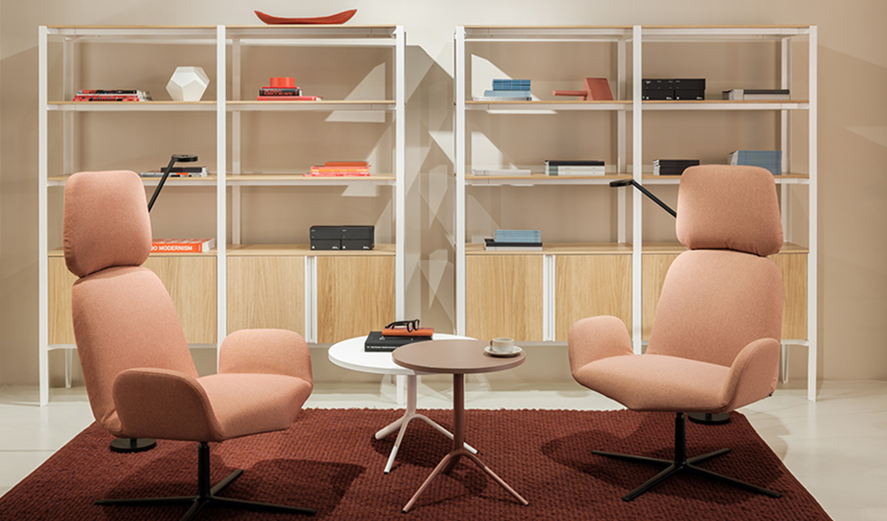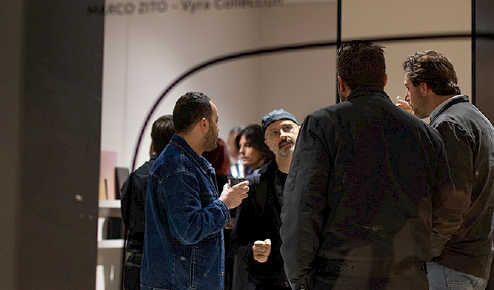 En la galería de entrada, la nueva colección de asientos loungeVyra, fruto de la colaboración con el diseñador Marco Zito, recibe a los visitantes con formas suaves y colores envolventes. La característica forma en V del asiento es un signo claro y distintivo que define toda la colección. En su versión con respaldo bajo, Vyra es ideal para momentos de relax, conversación y espera, mientras que la versión con respaldo alto es perfecta para contextos de diálogo más íntimos y recogidos.