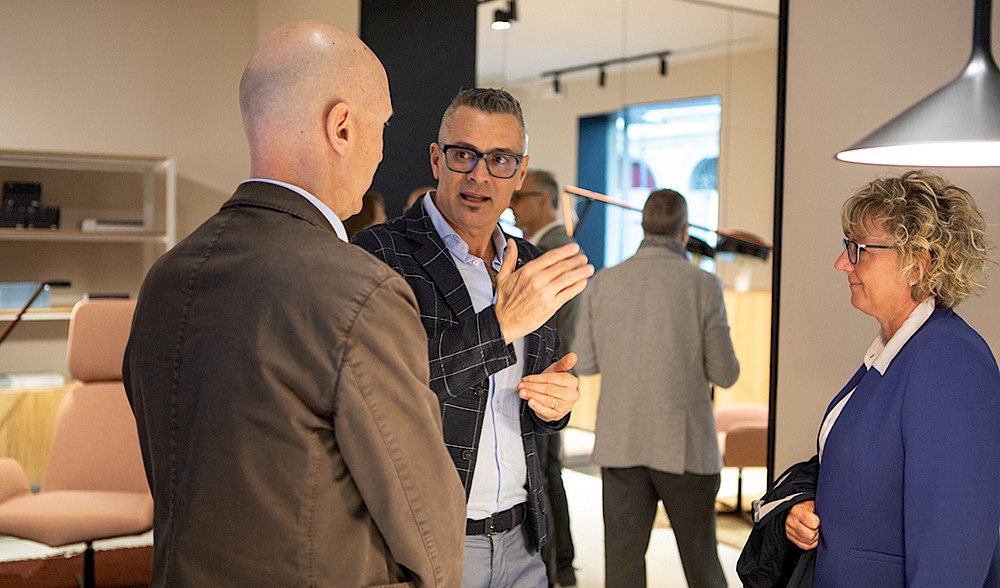 Los escaparates del showroom ya anticipan desde el exterior el hilo conductor que caracteriza todo el montaje: un signo gráfico que, desde lo bidimensional, adquiere forma tridimensional en los productos, acompañando al visitante en el descubrimiento de las nuevas colecciones.