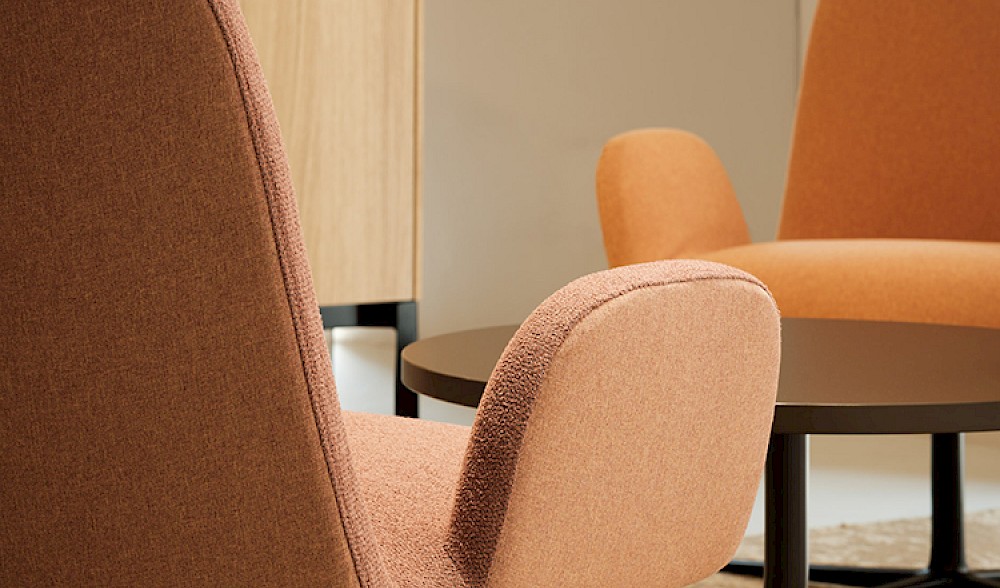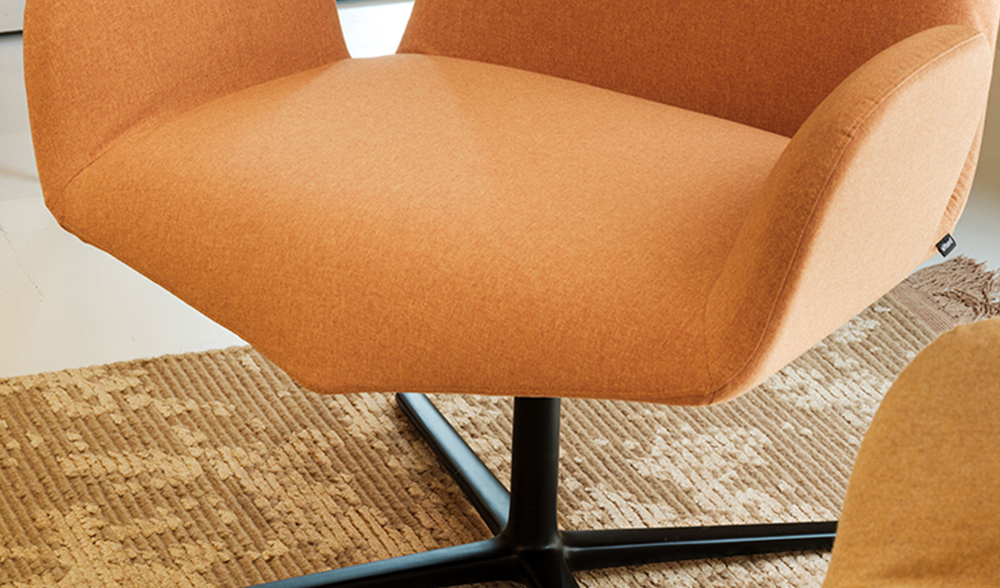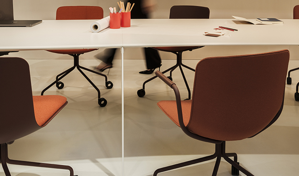 En el amplio open space final, ambientado como un estudio creativo, los asientos Cast y Skipper acompañan las formas sinuosas de la mesa con color y dinamismo. La colección de asientos Cast demuestra toda su versatilidad: presencia ligera y dinámica, con combinaciones cromáticas a la vez elegantes y vibrantes. Las sillas Skipper, por su parte, destacan por su comodidad e integran el espacio con naturalidad gracias a sus líneas ergonómicas y esenciales.