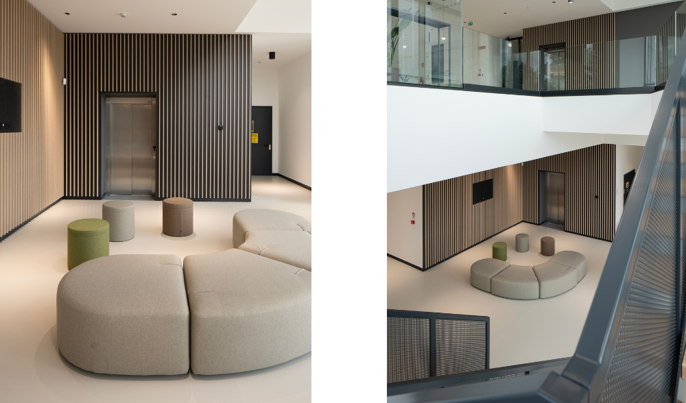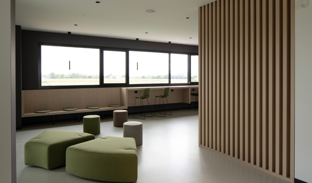 Der Empfangsbereich begrüßt Besucher und Mitarbeiter mit einem Lido-Sofa und Dodo-Poufs von Sitland – die Hauptakteure eines Raumes, der durch weiche Linien und ausgewählte Materialien Komfort und Qualität vermittelt. Die gewählte Farbpalette – von Grün bis zu Erdtönen – erinnert an die Natur der umliegenden Landschaft und trägt zu einer entspannten, natürlichen Atmosphäre bei.