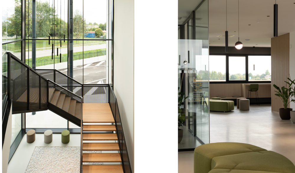 Die Innenräume des neuen italienischen Hauptsitzes von Recom Power Systems zeichnen sich durch einen schlichten und einladenden Stil aus, der darauf abzielt, eine komfortable Arbeitsumgebung in Harmonie mit der umgebenden Natur zu schaffen.